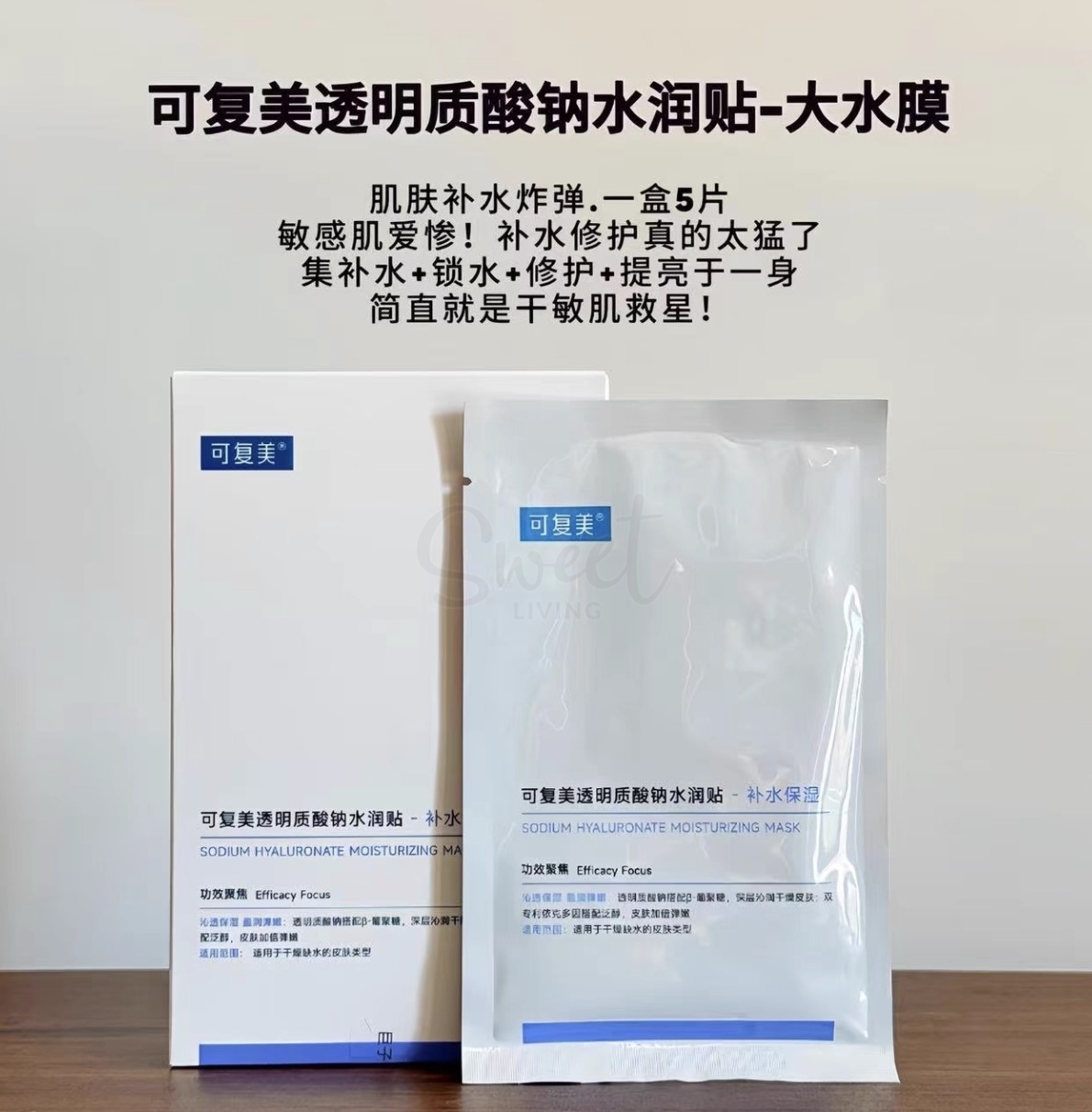 【中国】医药品牌 巨子生物 可复美 透明质酸钠水润贴 保湿沁润肌肤柔肤焕颜贴片面膜 5片/盒/ Comfy Sodium Hyaluronate Hydrating Mask 5 sheets